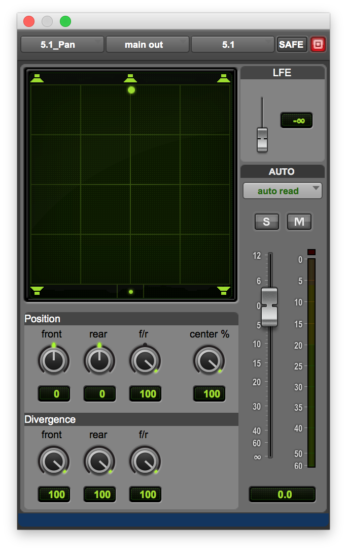 Traditionally, mixes were done in 5.1 for a very long time. (I am not going into Mono mixes as that is mostly irrelevant today unless a creative technique.) This means that the speakers we had were Left, Center, Right, Left Surround, Right Surround and Low Frequency Elements. This is usually abbreviated as L, C, R, Ls, Rs, LFE. Within Pro Tools, the Pan position is as shown in the figure below.