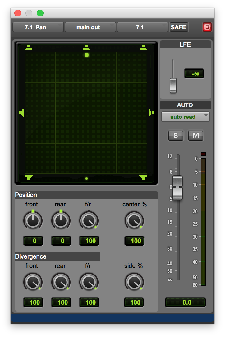 You can see the speaker positions in the above figure. The little dot is what we use to position the sound in the field. But in the theater, this is not as simple as this. The Surrounds are actually an array of speakers. So, although in the above picture the surrounds are a point source, in the theater, this is actually not. One of the things to get your head around initially is also the position and the sound in the theater. For example, if you pan the dot to the speaker in the Right Surround, the sound in the theater would come from the array on the right and not exactly the back.