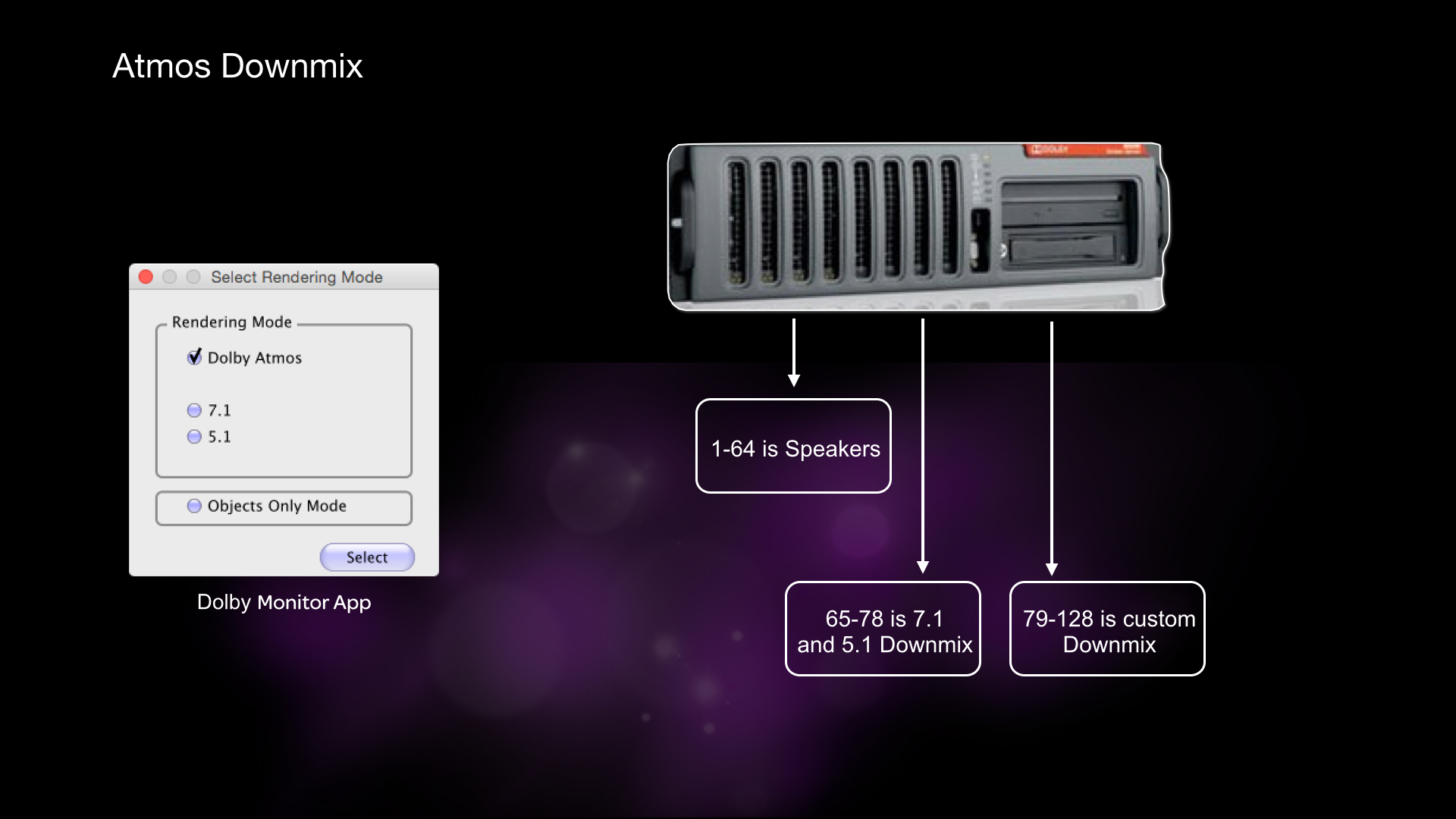 The output of the RMU is a total of 64. This means the maximum number of speakers that can be addressed in the theater is 64. So, input is 128, output is upto 64. That being said, the number of speakers in a theater depends on the size of the theater. They can go anywhere from 16 to 64. The beauty in this is that the format is scalable. Which means a sound placed 1/3rd between the screen and back wall will be 1/3rd from the screen to back wall irrespective of the size of the room. (Eg, if the length is 3 meters in the mix room, it will be at 1 meter. If the Hall it is playing back is 6 meters long, the sound will be reproduced at 2 meters, thus keeping the ratio.) The geography will be accurately maintained for anyone watching the movie.