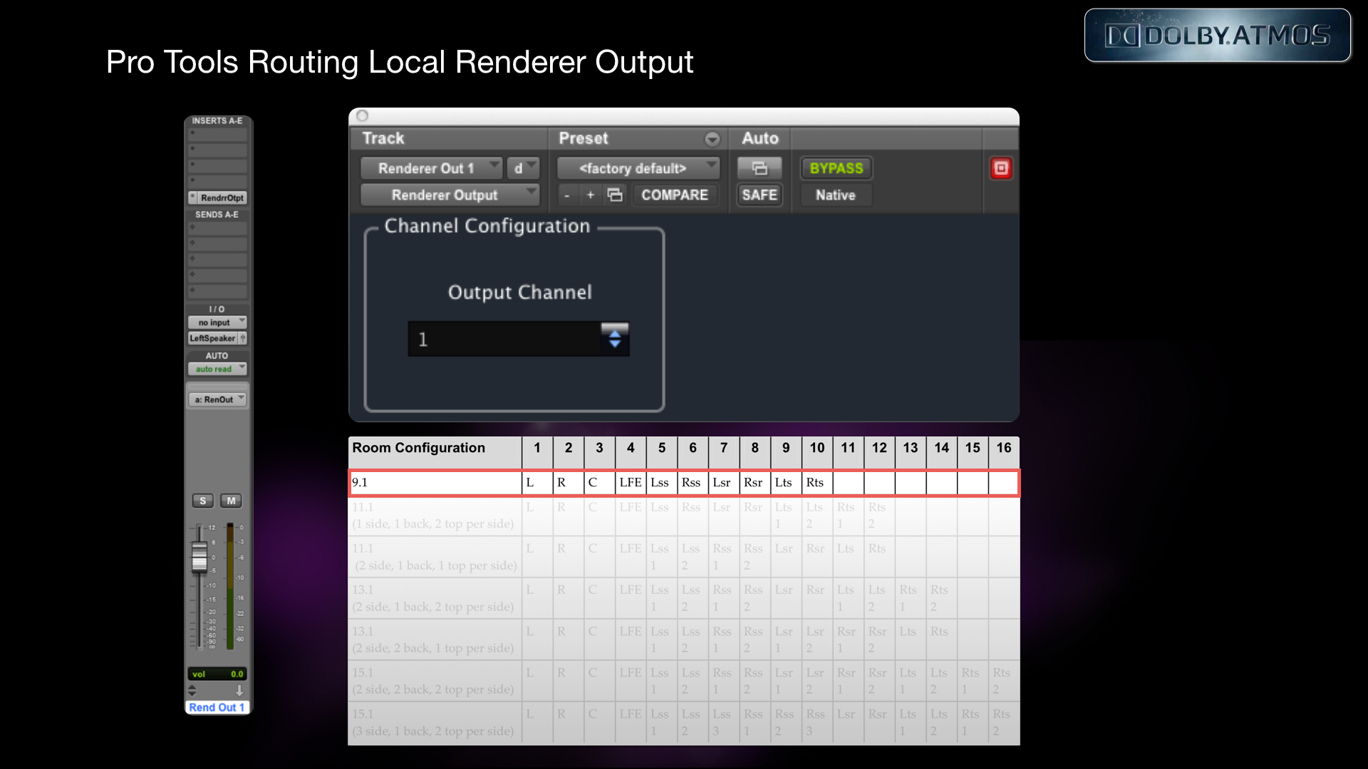 Basically, there are 2 plugins that are additionally installed while installing the Local Renderer. These are the Local Renderer Input and Local Renderer Output. The plugins do what is said. Send to the Renderer (input) and receive mix from the renderer (output). The Local renderer can support upto 16 speakers. So you would be needing an HD IO 16×16. Logically, this is how the Pro Tools session would look like in the sound editors room.