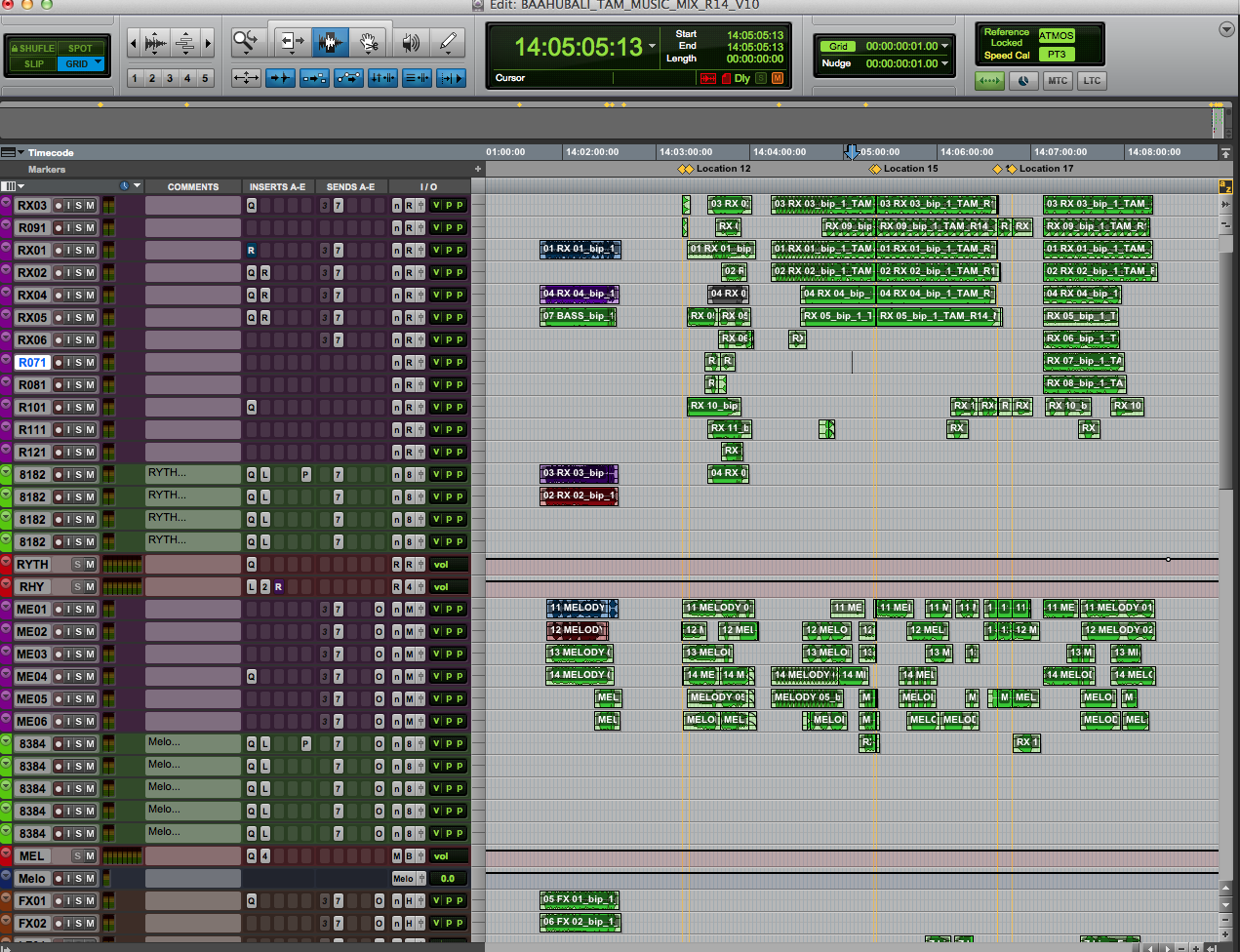 In a war oriented film like Bahubali the rhythm pattern mix is very critical. On many occasions, the rhythm tracks have been used as an object to bring in more width and separation, especially in the Hi-Mid frequency. We also experimented with having objects in screen wide surrounds instead of the screen channels. This technique helped a lot in getting more separation and less clumsiness in the 7.1 & 5.1 downmix. Wide pan technique was used on double bass, violins, horns etc. Personally, I don’t see any problem with object panning in music tracks, provided the height and width parameters of the panner are properly managed. Overhead channels were used for reverb of the score which mainly included horns and the strings section. This helped in enlarging the total sound spectrum and making it more immersive for the audience. To play out the drama, vocal FX, reverbs of aalaps etc were used as overhead. There were separate 7.1 Bus masters for Rhythm, Horns, Strings, Chorus and Music on HD Native workstations which were routed to a common input on the HDX2 workstation. The main reverbs we used were Phoenixverb from Exponential Audio. One of the beauty of this reverb is that it was created for music with lush silky reverb tails and has one of the smoothest sonic textures I know.