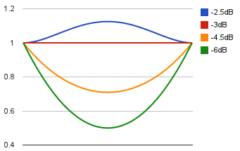 If we plot all the Pan Laws in the -3dB law, you will see it as: